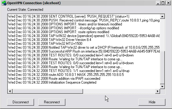 Sun Sep 25 11:58:59 2011 PUSH: Received control message: 'PUSH_REPLY,route 10.8.0.1,topology net30,ping 10,ping-restart 120,ifconfig 10.8.0.6 10.8.0.5'