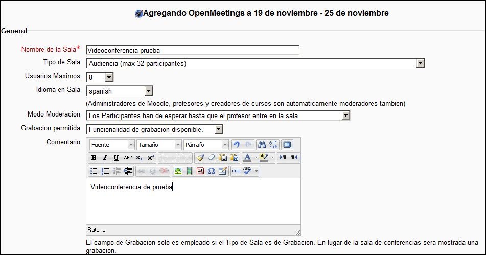 Presionamos el botón “Guardar Cambios”. Para probarlo se crea un nuevo curso y se añade como actividad Openmeeting: