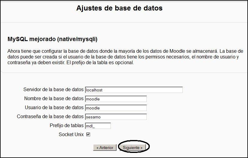 Empezamos con la configuración de Moodle, seleccionamos como base de datos MySQL y configuramos la conexión: