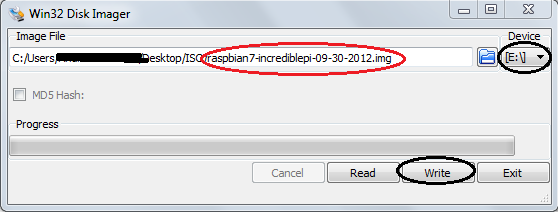 Para empezar descargamos la imagen y la descomprimimos. Luego (para Windows) descargamos la utilidad “Image writer for windows” y descomprimimos el paquete. Insertamos la tarjeta de memoria en la ranura del PC/Portatil y lanzamos el archivo Win32DiskImager.exe: