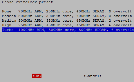Ahora, si queremos, podemos “overclockear” el procesador que normalmente trabaja a 700 MHz para llevarlo a 1000 MHz. Esto sin perder la garantía del Raspberri_pi.