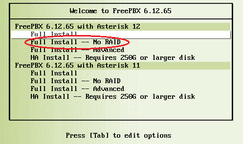 Seleccionamos la instalación de Asterisk 12 sin RAID: