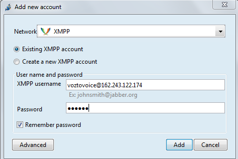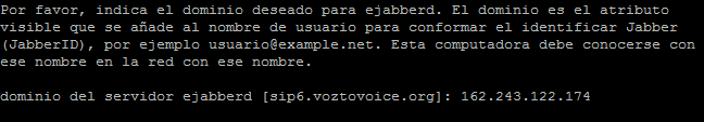El usuario será voztovoice y su contraseña sesamo. La IP es la misma del servidor Ejabberd.