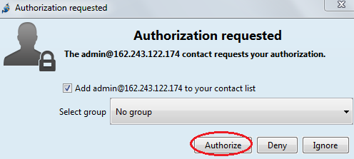 Se configura el usuario voztovoice y se presiona el botón Add. Como el certificado del servidor Ejabberd es auto firmado, Jitsi preguntará si continuar. Una vez aceptado el certificado aparecerá la solicitud de “amistad” del usuario admin:
