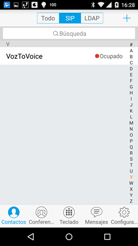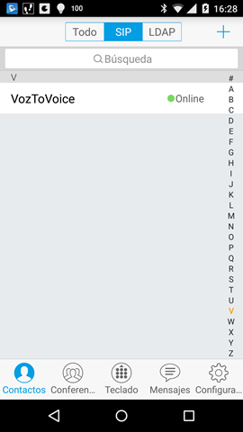 Pantallazo del menú contactos con un contacto presente (en línea y disponible):