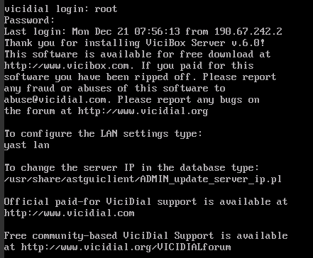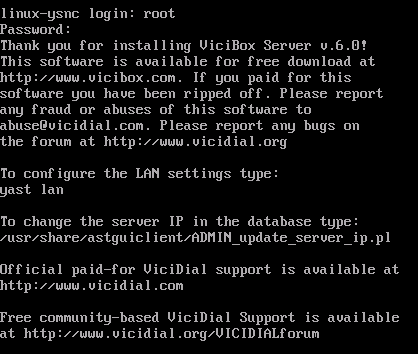 Al prompt de login escribimos como usuario root y como contraseña vicidial. Accedemos al servidor vía SSH y empezamos el proceso de instalación del sistema operativo (OpenSUSE 13.1) con el siguiente comando: